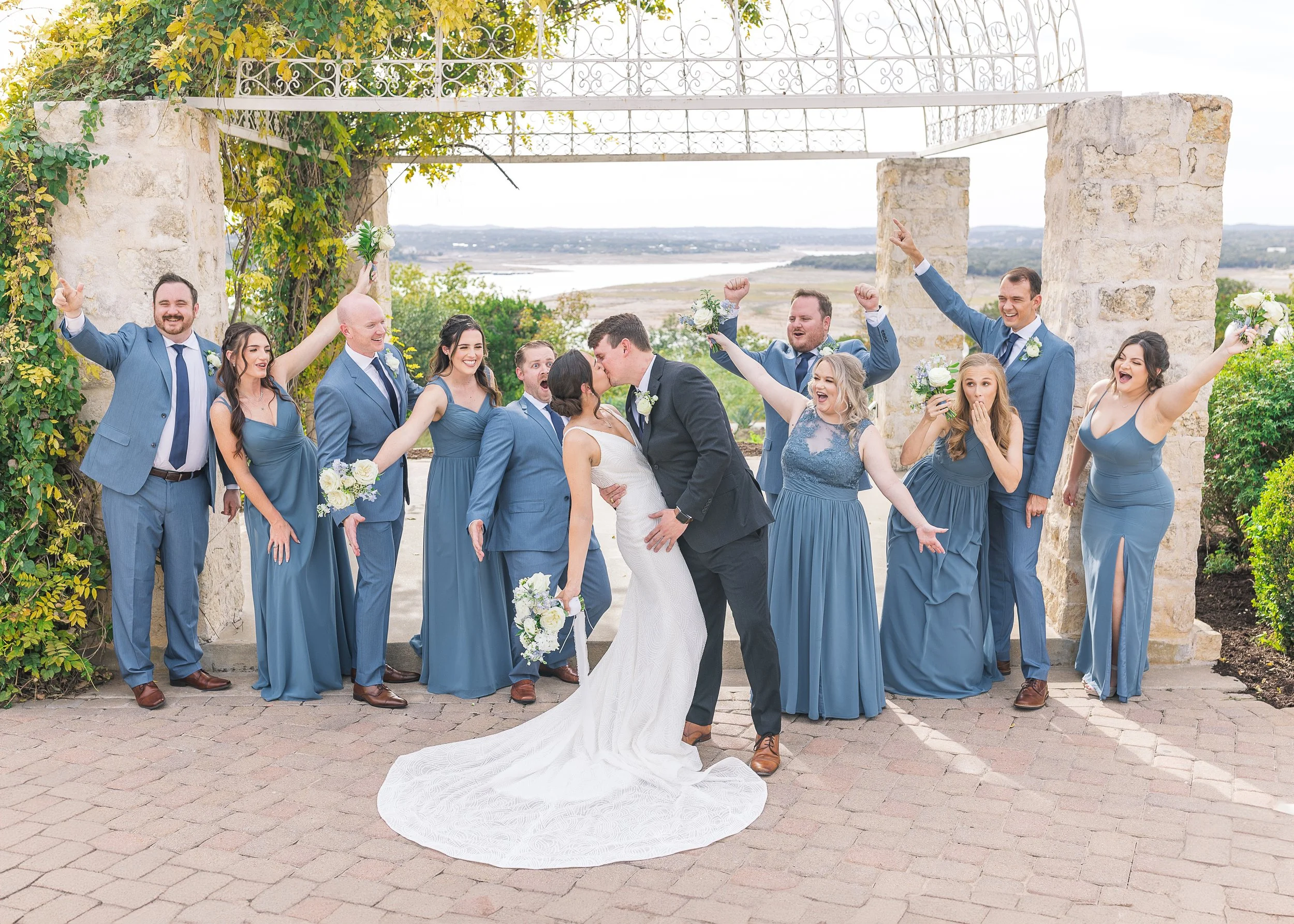 As an Austin wedding photographer, there are some weddings that I just know are going to exude love and joy from the second I arrive to the venue. That’s exactly what Matt and Summer’s day did in October 2023. I had the privilege of documenting their truly magical wedding at Vintage Villas overlooking the iconic Austin landmark of Lake Travis. The glowy setting over the lake itself was breathtaking, with the bridal party bathed in soft hues of light blue that perfectly complemented the romantic vibes of the evening.
