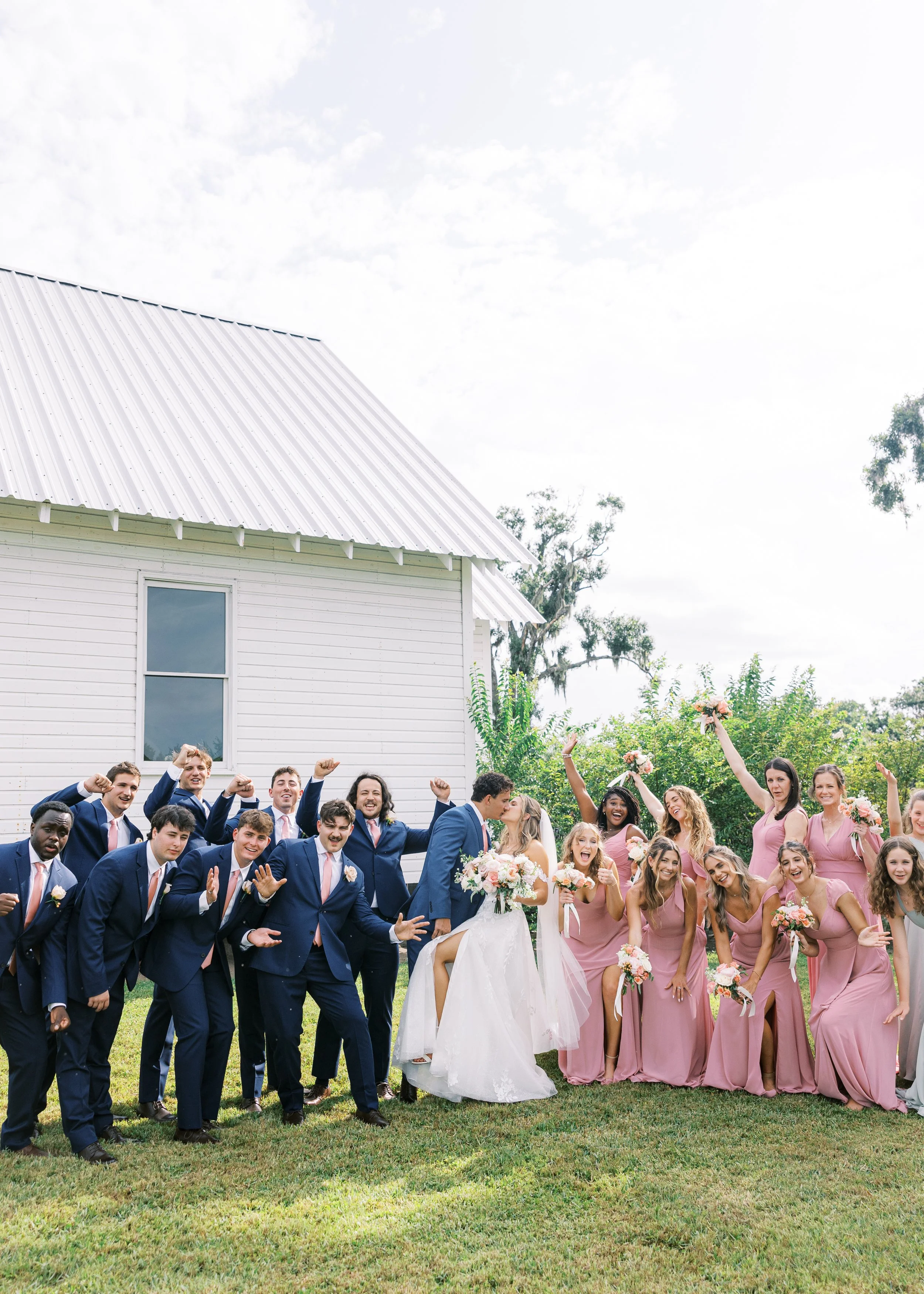 As the sun dipped behind the oaks at Southern Grace 1916, the reception turned into an unforgettable celebration, equal parts elegant and wildly fun. The dance floor was alive from the moment the music started and stayed packed all night, with guests twirling under string lights and bubbles floating through the air thanks to many bubble guns among the bridal party.